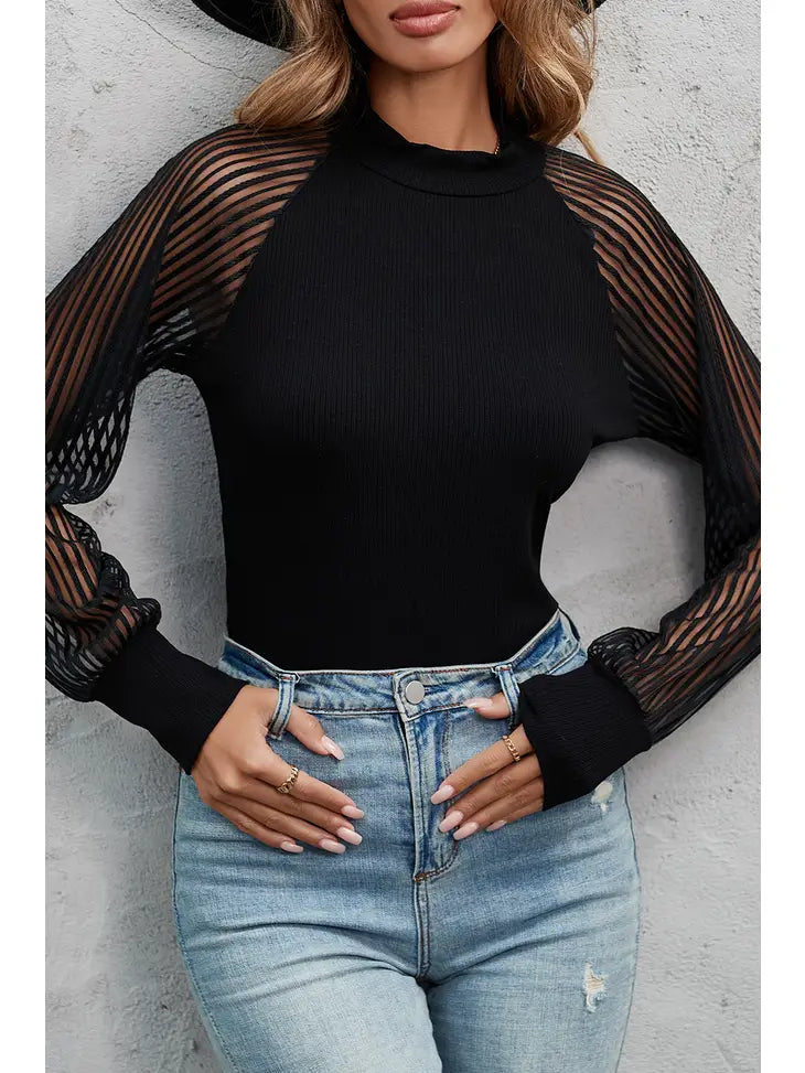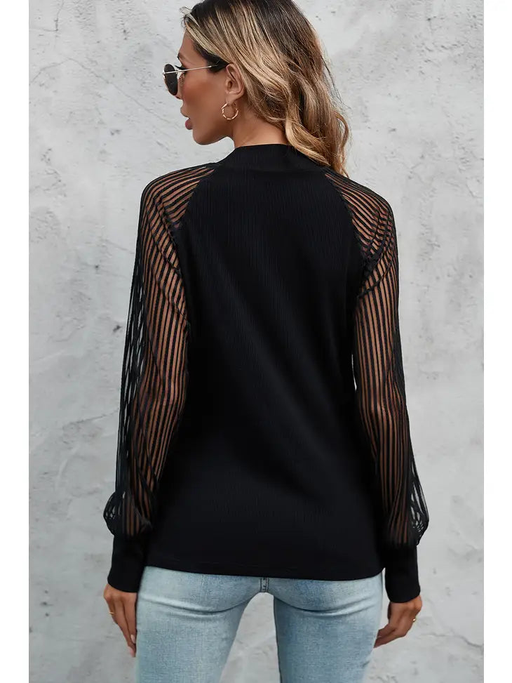 Black Striped Mesh Long Sleeve Crewneck Ribbed Top